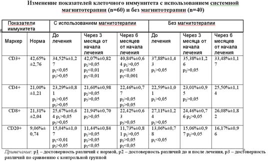 Результаты лечения свидетельствуют о явно выраженных сдвигах в улучшении иммунного статуса. Повышение иммунитета носит длительный (около 6 месяцев) характер. Графически результаты выглядят следующим образом :